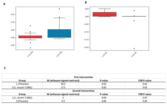 Relative abundance of the delta values of Verrucomicrobia phylum. The box plots indicate the relative abundance of Verrucomicrobia phylum between the final and the beginning points of each intervention—t3-t1 (A) and t6-t4 (B)—due to the treatment and the number of patients (n) of each group and treatment. (A) shows data for the first part of this intervention study (First intervention, 1: placebo; 2: L. reuteri V3401), whereas (B) shows data from the intervention after the crossover (Second intervention, 1: L. reuteri V3401; 2: placebo). (C) describes the Wilcoxon signed-rank test values and the significant levels by means of p and FDR p-values. FDR: False discovery rate; ♦: outliers data values.