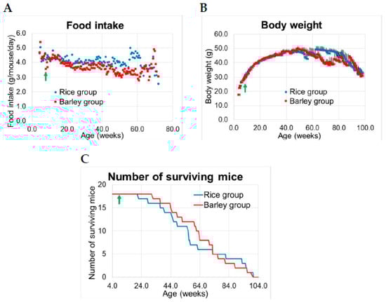 Food consumption, body weight, and number of surviving senescence-accelerated mouse-prone 8 (SAMP8) mice consuming rice or barley diets during the lifespan: (A) food consumption (g/mouse/day), (B) body weight (g), mean ± SE, (C) number of surviving mice. Green arrow; start timing of mild high-fat diets.