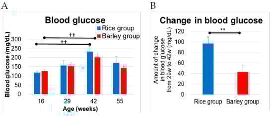 Changes in blood glucose in SAMP8 mice consuming rice or barley diets: (A) Levels of blood glucose at 16, 29, 42, and 55 weeks old; (B) amount of change in blood glucose from 29 to 42 weeks old. The blood glucose in both groups increased with age from 16 to 42 weeks old. The blood glucose levels of one mouse in the rice group and one mouse in the barley group of age 42 weeks, as well as one mouse in the rice group of age 55 weeks were over the limit of detection and were therefore set at 500 mg/dL. ††; p < 0.01; within group comparison at 29, 42, 52 weeks old vs. at 16 weeks old by Dunnett test. ** p < 0.01; rice group vs. barley group by unpaired t-test.