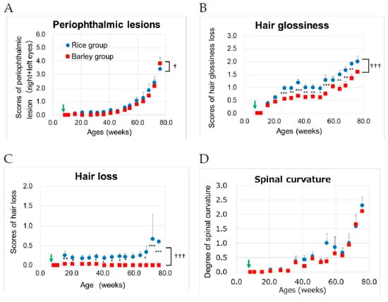 We performed two-way ANOVA to assess the effects of the groups on aging-related scores. Group (F (1,386) = 5.46, p = 0.020) and age (F (15,386) = 46.2, p < 0.001) were significantly associated with the scores of periophthalmic lesions (Figure 4A). There was no significant interaction between group and age (F (15,386) = 0.41, p = 0.975). In hair glossiness, group (F (1,386) = 89.3, p < 0.001) and age (F (15,386) = 47.3, p < 0.001) were significantly associated with the scores (Figure 4B). There was a significant interaction between group and age (F (15,386) = 2.29, p = 0.004). Using the Bonferroni’s post-hoc test, the scores of hair glossiness in the barley group were significantly lower than those in the rice group after the age of 27 weeks (p < 0.001; 27, 36, 54 weeks old, p = 0.002; 31 weeks old, p = 0.003; 41 and 64 weeks old, p = 0.008; 46 weeks old, p = 0.016, 51 weeks old, p = 0.001; 68 weeks old, p = 0.004; 72 weeks old), but not at 59 and 76 weeks (p > 0.05). In terms of hair loss, group (F (1,386) = 84.2, p < 0.001) and age (F (15,386) = 2.27, p = 0.004) were significantly associated with the scores (Figure 4C). There was a significant interaction between group and age (F (15,386) = 2.24, p = 0.005). Using the Bonferroni’s post-hoc test, the scores of hair loss in the barley group were significantly lower than those in the rice group after the age of 16 weeks (p = 0.006; 16 weeks old, p = 0.038; 21 weeks old, p = 0.024; 36 weeks old, p = 0.043; 41 weeks old, p = 0.028; 46 weeks old, p = 0.022; 51 weeks old, p = 0.024; 54 weeks old, p = 0.011; 68 weeks old, p < 0.001; 72, and 76 weeks old). In terms of spinal curvature age (F (15,386) = 22.3, p < 0.001), but not group (F (1,386) = 3.57, p = 0.059), was significantly associated with the scores (Figure 4D). There was no significant interaction between group and age (F (15,386) = 0.64, p = 0.840).