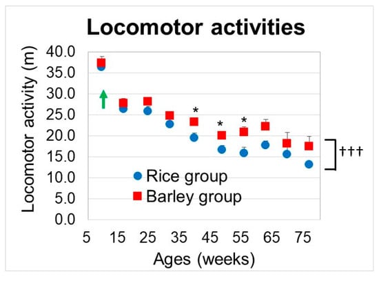 Changes in locomotor activities in SAMP8 mice consuming rice or barley diets during the lifespan. By two-way ANOVA, ††† p < 0.001; group, * p < 0.05; between-group comparison at 39, 48, and 55 weeks old by unpaired t-test. Green arrow; start timing of mild high-fat diets.