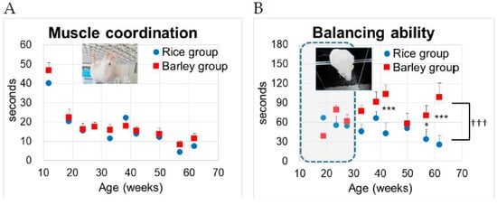 Changes in muscle coordination and endurance balancing in SAMP8 mice consuming rice or barley diets during the lifespan: (A) wire hanging test; (B) balancing on an acryl rod. By two-way ANOVA, ††† p < 0.001; -group, *** p < 0.001, * p < 0.05 by Bonferroni’s post-hoc test for multiple comparisons.