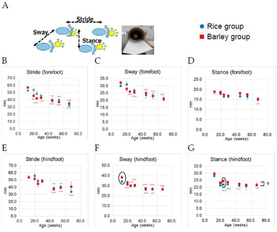 Changes of parameters in the foot print test in SAMP8 mice consuming rice or barley diets during the lifespan: (A) Measurement of six points in the foot print test (sway, stride, and stance in forefoot and hindfoot); (B) stride of forefoot; (C) sway of forefoot; (D) stance of forefoot; (E) stride of hindfoot; (F) sway of hindfoot; (G) stance of hindfoot. By two-way ANOVA, † p < 0.05; group. The circle surrounding the symbols indicate a significant difference between groups by unpaired t-test (p < 0.05). * p < 0.05; ** p < 0.01; *** p < 0.01 (blue color; Rice group, red color; Barley group); within group comparison by Dunnett test vs. 12 weeks old.