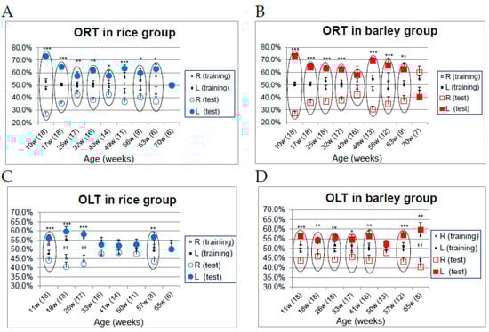 Maintaining cognitive functions as well as physical abilities is essential for healthy aging. The recognition indices of familiar and novel objects during the test phases of ORT in the rice and barley groups are illustrated in Figure 8A,B (ORT), and Figure 8C,D (OLT), respectively. The circles surrounding the symbols of familiar and novel (location) objects recognition indexes indicate a significant difference during the test phase, but no significant difference during the training phase (Figure 8A–D).