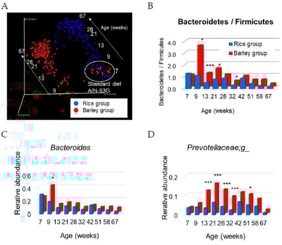 Changes in the intestinal microbiome in SAMP8 mice consuming rice or barley diets: (A) UniFrac analyses (unweighted); (B) Bacteroidetes (phylum)/Firmicutes (phylum); (C) Bacteroides (genus); (D) Prevotellaceae;g_(genus). All data at 7, 9, 13, 21, 28, 32, 42, 51, 58, and 67 weeks old are plotted as weighted and unweighted UniFrac analyses. * p < 0.05, *** p < 0.001; rice group vs. barley group by unpaired t-test.