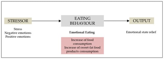 Behavioral approaches identify a consistent construct that distinguishes people who eat more in response to emotions [] because they are cue-reactive to external stimuli and those who do so when they cannot manage their emotions []. The latter behavior is known as “emotional eating”, characterized by an overconsumption of high-density foods as a coping strategy to stress [] or intense emotions, both negative [] and positive []. Emotional eaters seem to display this pattern when an stressor appears in their everyday life, triggering an increase in food consumption, particularly that of sweet-fat (i.e., energy-dense) food products, leading to an improvement in their emotional state (Figure 1) [,].