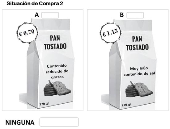 The participants were allowed to inspect all the toast packages (which included the nutritional claims) on the designated shelf of the experiment room and which corresponded to products present in the Spanish market. During this inspection, they could find information related to the type of toast, nutritional claims, and price per package, but information about brands, ingredients, and manufacturing method was missing.