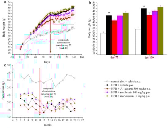 Body weight and food intake. Mice were fed with a normal or a high fat diet (HFD) for 139 days. From day 77 (week 11), the animals were treated daily with vehicle (CMC 1%), P. vulgaris extract 500 mg/kg per os (p.o.), metformin 100 mg/kg p.o., and atorvastatin 10 mg/kg p.o. (a,b) Animals’ body weight evolution, and (c) Animals’ food intake evolution. Red arrows point to the beginning of compound administration (day 77, week 11). Each value represents the mean ± S.E.M. of 12 mice per group. ** p < 0.01 vs. normal diet + vehicle; ^^ p < 0.01 vs. HFD + vehicle.
