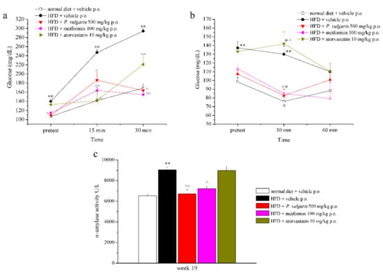 C57BL/6 mice were fed with either a normal diet or a high fat diet (HFD) for 19 weeks. Throughout all this time, many parameters were periodically assessed: Body weight, food intake, hematic levels of glucose, triglycerides, and total cholesterol. From the eleventh week on, the mice fed with a high fat diet were divided into three groups and treated with P. vulgaris extract 500 mg/kg, metformin 100 mg/kg, and atorvastatin 10 mg/kg. Control groups of both types of feeding were challenged with the vehicle alone (CMC 1%). The drugs, the food extract, and the vehicle were administered daily per os (p.o.), 30 min before the dark phase of the circadian light/dark cycle of mice in the animal facility.