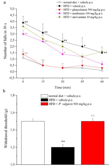 A growing body of literature links prediabetes, obesity, and metabolic syndrome to the risk of diabetic peripheral neuropathy as well as cryptogenic sensory peripheral neuropathy [41]. On this basis, we focused on neurological impairments; in the HFD group we observed a decreased pain threshold, highlighting a condition that resembles mechanical allodynia, as well as altered motor coordination. Interestingly, these alterations were reverted only in the P. vulgaris extract treated-group. This point could be explained since phytotherapy is based on the combined action of a mixture of constituents able to offer a multiple approach to the multi-factorial nature of the metabolic syndrome. The bioactivity of crude drugs or vegetal extracts is a summation of antagonistic and/or synergistic effects on bioavailability, cellular transport processes, compound metabolism, and pharmacodynamic mechanisms, which could explain the positive effect of P. vulgaris extract also on pain threshold and motor alterations induced by HFD. On the contrary, metformin and atorvastatin, two drugs with a specific function and mechanism of action, are ineffective. No effects on thermal hyperalgesia or anxiety were recognized in HFD-fed animals. A similar annotation of metabolic syndrome fallouts on neurological behavior was published in a work by Takase and his colleagues, who observed that HFD evoked motorial disfunctions in mice, with no influences on anxiety [42].
