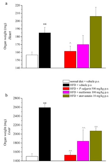 The heart, the liver, and the brain were weighed: the heart and the liver of non-treated HFD mice had a higher weight than the organs of mice fed with a normal diet (Figure 5a,b). The administration of P. vulgaris extract reduced the weight gain of the heart and liver ensuing the fat-enriched diet, reaching a weight highly close to that of the control mice organs. Tissue weight of the liver, but not the heart, was brought down also by metformin and atorvastatin administrations, but in a less remarkable way than the food extract did: the latter reduced the weight by 40%, the drugs only by 30 and 20 percent, respectively (Figure 5b). As to the brain, no significant alterations were observed when comparing tissue weight of the different experimental groups (Supplementary Figure S1).