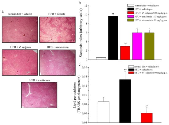 Other histological and quantitative examinations were performed on the explanted tissues. As is shown in Figure 6a, the hypercaloric diet caused a diffuse steatosis in the hepatic parenchyma, not present in the liver of normal diet-fed mice. The pathological state was also expressed in numbers by the steatosis index, as 9.66 ± 0.33 vs. 0.5 ± 0.1, referring to HFD and control mice, respectively (Figure 6b). Another liver damage parameter to be evaluated was lipid peroxidation, expressed as micromoles of thiobarbituric acid reactive substances (TBARS) per milligrams of protein present in the sample. Feeding with fat-rich food caused a 40% more oxidative state of the lipidic component in comparison to the control, while P. vulgaris extract treatment avoided the lipid peroxidation increase, whose state was maintained similar to the control levels (Figure 6c).
