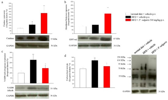 In Figure 7, four cardiac damage parameters are illustrated: the expression of catalase enzyme (7a), glutathione reductase enzyme (7b), NADH dehydrogenase enzyme (7c), and the level of protein carbonylation (7d). Catalase enzyme expression, involved in the detoxification of hydrogen peroxide, appeared to be increased by 62% in the hearts of HFD mice and by 200% in those of HFD mice challenged with P. vulgaris extract, in comparison with the control hearts. As to glutathione reductase, which reduces oxidized endogen glutathione, its expression was positively modulated by a high fat diet and by P. vulgaris extract administration. In the graph, the integrated density calculation showed a 23% increased expression in the hearts of HFD mice and an 180% increase in those of HFD P. vulgaris extract-treated mice. The third analyzed enzyme was NADH dehydrogenase, also named Complex I, which transfers electrons from NADH to an acceptor in the mitochondrial respiratory chain. The results show that the prolonged alimentation with high fat food stimulated a significative increase of the enzyme expression with respect to the control. The integrated density calculated on heart samples of the HFD animals increased by 120%, compared to the control. A decreasing trend, but not statistically significant, was observed when the animals were challenged with P. vulgaris extract. Eventually, protein carbonylation dosage gave a measure of the oxidative stress state of the heart. Carbonylated proteins were 45% more in the heart of the HFD animals, compared to the control animals, a condition which was not reduced in a significant way by P. vulgaris extract administration.