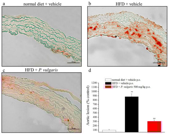 The high fat diet caused a gain weight of liver and heart in the HFD mice, but it was significantly lowered by treatment with P. vulgaris extract. Also, the other steps of on-going metabolic syndrome were confirmed. Histological samples from the HFD group clearly showed hepatosteatosis, hepatic lipid peroxidation, and lipid accumulation in the cardiovascular system, such as the fatty streaks in the aorta. These disease-related negative consequences were reverted by P. vulgaris extract challenge.