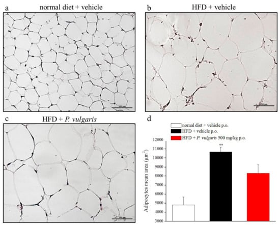 Adipose tissue damage. (a–d) Effects of diet and P. vulgaris treatment on white adipose tissue. (a–c) Representative images of subcutaneous adipose tissue sections stained with hematoxylin-eosin, 20X magnificated. (d) Quantitative determination of adipocytes mean area (µm2) following HFD or P. vulgaris administration. Each value represents the mean ± S.E.M. of 12 mice per group. **p < 0.01 vs. normal diet + vehicle.