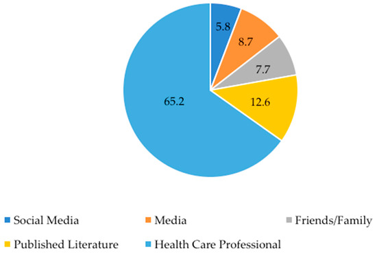 The primary information sources regarding dietary supplements used by parents are shown in Figure 2. Sixty-five percent (65%) of parents indicated that health care professionals (e.g., physician, nurse, nutritionist) were their primary source of information regarding dietary supplements. Published literature and media (e.g., news, magazines, journals) were listed as the second and third most popular sources of information. Social media was the least utilized source, with only 5.8% of parents indicating use. Two participants did not indicate a primary information source and two other participants indicated “knowledge over the years,” and “myself (pharmacist)” in the “other” section.