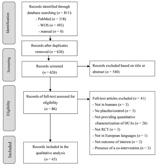 Flowchart of the study selection process. Legend: HCAs: Hydroxycinnamic acids; RCT: Randomized controlled trial and WOS: Web of Science.