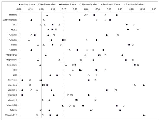 The first nutrient patterns identified in both cohorts were qualified as “healthy” (healthy-France and healthy-Quebec, Figure 1), and were characterized by higher intakes in carbohydrates, dietary fiber, magnesium potassium, iron, carotene, and vitamins C, E and B6. Differences between the two cohorts were notable for two specific nutrients. Compared to the healthy-Quebec, the healthy-France pattern was negatively associated with vitamin D intake (factor loadings (FLs) of −0.19 vs. 0.22), and positively associated with folate intake (FLs of 0.69 vs. 0.02). The second nutrient pattern identified in both cohorts was qualified as a Western pattern, characterized by higher intakes of proteins, lipids (saturated, monounsaturated, and n-3 and n-6 polyunsaturated fatty acids (PUFAs)), calcium, phosphorus, magnesium, vitamin D, and folates, but only for the Western-Quebec pattern (FLs for folates of 0.44 vs. 0.08). The third more traditional nutrient pattern in both cohorts corresponded to diets rich in vitamins A and B12. Higher intake of zinc was observed in the traditional-Quebec pattern (FLs of 0.50 vs. 0.07), whereas higher intake of folates was noted in the traditional-South West of France pattern (FLs of 0.45 vs. −0.01). Average nutrient intake across quartiles of the factor scores are presented in Table 2.
