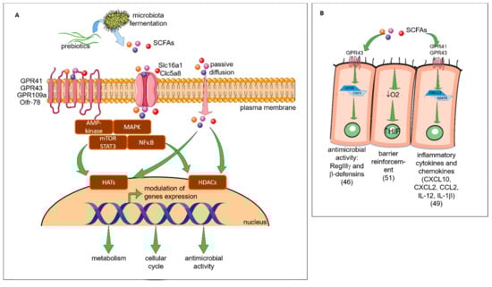 Prebiotics, by their ability to be fermented by bacteria, induce the production of SCFAs and thus act indirectly on health. SCFAs can be used in the gut intestinal tract by the microbiota for their own metabolism or released in the lumen. In the lumen, SCFAs can specifically interact with different cells such as intestinal epithelial cells (IEC) or innate/adaptive immune cells to modify various cellular processes as well as gene expression, differentiation, proliferation and apoptosis. SCFAs can activate G protein coupled receptors (GPRs), such as GPR41 or the free fatty acid receptor (Ffar)3 (acetate = propionate > butyrate), GPR43 or Ffar2 (butyrate = propionate > acetate), GPR109a (butyrate) and olfactory receptor (Olfr)-78 (propionate = acetate), to modulate cell development, function and survival []. They can also enter directly into the cells through transporters solute carrier family 16 member 1 (Slc) 16a1 and Slc5a8 or by passive diffusion to subsequently induce signaling pathways [,]. Signaling pathway induced by SCFAs-binding are mediated by various actors: protein kinases, such as the AMP-activated protein kinase (AMPK) [], mitogen-activated protein kinases (MAPK) [], mammalian target of rapamycin (mTOR), signal transducer and activator of transcription 3 (STAT3) [] or nuclear factor kappa-light-chain-enhancer of activated B cells (NFkB) []. Either by downstream signaling pathways or directly, SCFAs modulate the function of several enzymes and transcription factors including histone acetyltransferase (HATs) or histone deacetylases (HDACs) []. Consequences of SCFAs-related genes transcription modification is well described: modification of cellular cycle, anti-microbial effects and metabolism (regulation of lipogenesis and lipolysis in the cytosol of hepatocytes and adipocytes, and action on central appetite regulation) []. In the next section of this review, we focus on pro- and anti-inflammatory effects induced by SCFAs on epithelial and immune cells.