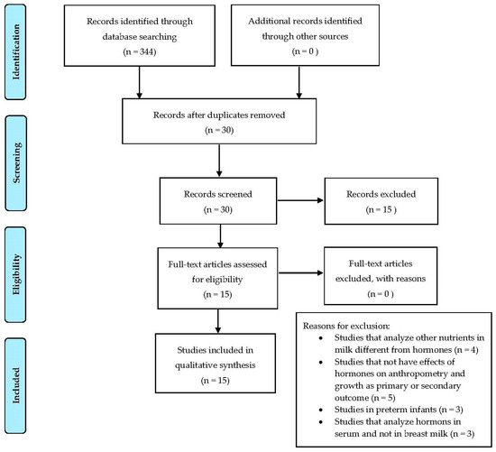 We performed a review using PUBMED, searching for all trails published in English from 2009 up to July 2019. The following key words were used: “Leptin” OR “Ghrelin” OR “IGF-1” OR “Adiponectin” OR “Insulin” OR “Adipokines” AND “BM” OR “donor milk” OR “banked milk” AND “weight gain” OR “body composition” OR “obesity” OR “adiposity” OR “growth” AND “infant” OR “children”. In this review, observational studies examining the effects of these BM hormones on infants’ and children’s anthropometry and growth were selected. A total of 344 articles were initially identified and, among them, 30 studies were retrieved and evaluated for inclusion as relevant studies for the analysis by reviewing the abstract, and, when necessary, the full text. A manual bibliographic cross-referencing was also performed. We also reviewed the reference lists of relevant studies in order to detect other relevant primary sources.