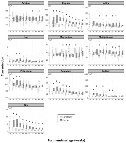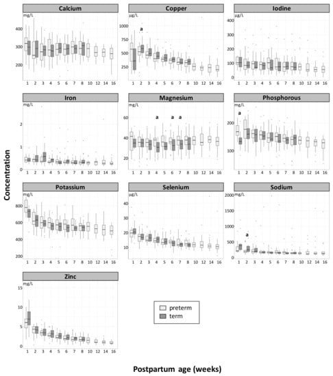 Longitudinal changes of mineral concentration (means) in term (dark grey) and preterm (light grey) human milk (HM) at an equivalent postmenstrual age. The letter (a) indicates if differences between term and preterm are significant p < 0.05. Box plots represent medians with 25th and 75th percentile, min-max range and outliers.