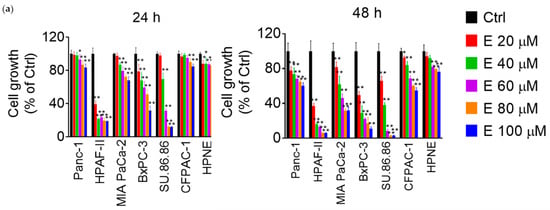 We first evaluated the effect of EGCG on pancreatic cancer cell growth and compared it to that of human pancreatic normal epithelial cells (HPNE). For this purpose, we treated six human pancreatic cancer cells as well as the HPNE cells with increasing concentrations of EGCG (20–100 μM) for 24 h and 48 h. As shown in Figure 1a, pancreatic cancer cell lines presented different degrees of sensitivity to EGCG. For example, the HPAF-II and SU.86.86 cells were sensitive to EGCG, with EGCG at 40 µM for 48 h reducing cell growth by 84% and 62% of control, respectively. In contrast, EGCG at 40 µM for 48 h reduced the growth of Panc-1 and CFPAC-1 cells by 27% and 17% compared to control, respectively. MIA PaCa-2 cells were moderately sensitive to EGCG, with growth being reduced by 38% under the same experimental conditions. Interestingly, EGCG had minimal effects on HPNE cell growth, and after treatment with EGCG at 40 µM for 48 h, cell growth was only reduced by 9% compared to controls (Figure 1a). Given their moderate and low sensitivity to EGCG, as well as their differential effect to chemotherapeutics [], we chose MIA PaCa-2 and Panc-1 cells for the subsequent studies.