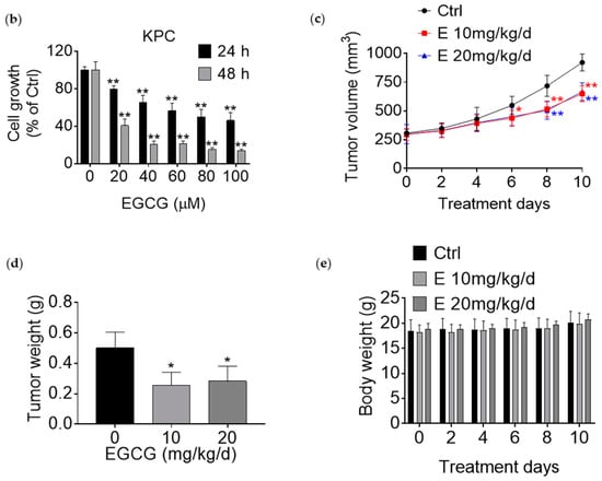 We next explored the chemotherapeutic potential of EGCG in murine pancreatic cancer models. First, as shown in Figure 1b, EGCG inhibited the growth of mouse pancreatic cancer KPC cells in culture in a time- and concentration-dependent manner. Next, KPC cells were injected subcutaneously into immunocompetent mice, which led to exponentially growing tumors. When the size of the tumors was ~300 mm3, the mice were treated either with EGCG at 10 mg/kg, EGCG at 20 mg/kg, or with PBS (vehicle control). At day 10, the tumor volumes (mean ± SD) for the vehicle control, EGCG 10 m/kg, and EGCG 20 mg/kg groups were 921.5 ± 74.7 mm3, 650.2 ± 69.3 mm3, and 668.2 ± 76.9 mm3, respectively (p < 0.01 for both; Figure 1c). At sacrifice, EGCG 10 mg/kg and EGCG 20 mg/kg reduced tumor weight by 49% and 45%, respectively, compared to vehicle-treated controls (p < 0.05 for both; Figure 1d).