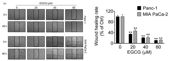 To determine the effect of EGCG and gemcitabine on pancreatic cancer cell migration and invasion, the wound healing assay was initially performed to evaluate cell motility. Gemcitabine alone reduced the wound healing rate in Panc-1 and MIA PaCa-2 cell lines by 44% and 23%, respectively, compared to vehicle controls (p < 0.01 for both). The wound healing rate was further reduced in the EGCG + gemcitabine combination group by 83% in Panc-1 cells (p < 0.01) and 82% in MIA PaCa-2 cells (p < 0.01 for both; Figure 6a).