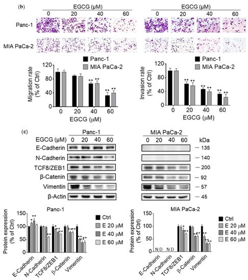 We examined the capacity of EGCG to regulate cell migration and invasion. First, we performed a wound healing assay to evaluate the effect of EGCG on cell motility. After 48 h of treatment, EGCG significantly inhibited wound healing capacity in a concentration-dependent manner in both cell lines tested (Figure 2a). Compared to vehicle-treated controls, EGCG at 40 μM reduced cell motility by 79% and 78% in Panc-1 and MIA PaCa-2 cells, respectively (p < 0.01 for both). This pattern was consistent with the effect of EGCG on cell migration and invasion (Figure 2b). For example, EGCG at 40 μM reduced cell migration in Panc-1 and MIA PaCa-2 cells by 34% and 33% (p < 0.01 for both; Figure 2b). A somewhat stronger inhibitory effect by EGCG was observed determining the invasion rate. EGCG reduced cell invasion in Panc-1 and MIA PaCa-2 cells by 54% and 60%, respectively (p < 0.01 for both; Figure 2b). Mechanistically, EGCG reduced select markers involved in the EMT process. After 48 h of treatment, EGCG increased the expression of E-Cadherin, while it reduced the levels of N-Cadherin in Panc-1, and decreased the expression levels of multiple mesenchymal markers, including TCF8/ZEB1, β-Catenin, and Vimentin in both cell lines (Figure 2c). Consistent findings were obtained in pancreatic tumor xenografts. Compared with control group, the expression of E-Cadherin significantly increased (p < 0.01), whereas levels of N-Cadherin and Vimentin were reduced in the 10 mg/kg/d EGCG treated group (p < 0.05 and p < 0.01; Figure 2d,e), as evaluated by Western blot and Immunohistochemistry. These results suggest a functional role of EGCG in inhibiting pancreatic cancer cell invasion and migration by regulating EMT markers.