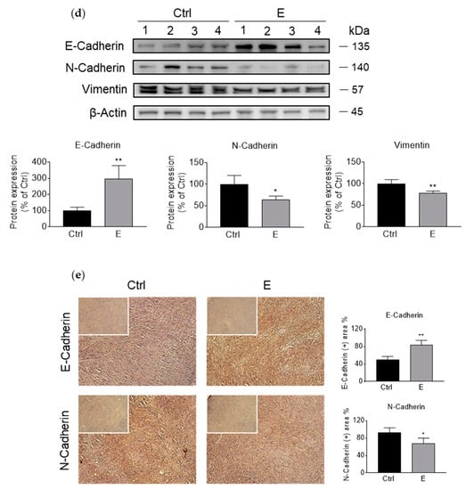 Immunohistochemistry for E-Cadherin and N-Cadherin was conducted as previously described [,]. Briefly, paraffin-embedded sections (5 μm thick) were deparaffinized and rehydrated, followed by antigen retrieval performed by microwave-heating in 0.01 M citrate buffer (pH 6.0) for 10 min. H2O2 (3%) was then applied to block endogenous peroxidase activity. Following blocking for 60 min with serum, slides were incubated with primary antibody (E-Cadherin, Cat #3195; N-Cadherin, Cat #13116; Cell Signaling Technology, Danvers, MA, USA) or control IgG (dilution 1/200) overnight at 4 °C. The next day, slides were washed thrice with PBS for 5 min each time. The biotinylated secondary antibody and the streptavidin-biotin complex (Invitrogen, Carlsbad, CA, USA) were added, each for 1 h at room temperature with an interval washing. After the last wash with PBS, slides were stained with 3,3′-Diaminobenzidine tetrahydrochloride hydrate (DAB) solution, then rinsed with distilled water, counterstained with hematoxylin. Slides were then dehydrated overnight, coverslipped, and images were taken at 100 × magnification. At least 5 fields per sample were analyzed and scored using Image J software based on the intensity of each field.