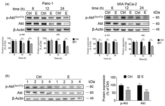 We examined whether EGCG affected the cell metastasis through Akt pathway in pancreatic cancer. First, we examined the effect of EGCG on Akt activation at various time points by measuring the levels of Akt phosphorylation. As shown in Figure 3a, EGCG decreased the levels of both phosphorylation and total Akt in both cell lines in a time-dependent manner. Consistent with the in vitro results, EGCG reduced the levels of p-Akt and total Akt (p < 0.01) in pancreatic tumor xenograft samples (Figure 3b).