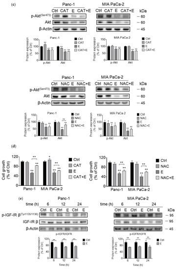 We then examined whether catalase and NAC could prevent the reduction in pancreatic cancer cell growth induced by EGCG. After 72 h of treatment, EGCG at 40 µM reduced cell growth by 48% and 47% in Panc-1 and MIA PaCa-2 cells, respectively. Co-treatment of catalase and EGCG reduced cell growth by 17% and 38% in Panc-1 and MIA PaCa-2 cells (Figure 3d). Of note, this effect was significantly different to that of the EGCG group (p < 0.01). Consistently, co-treatment with NAC showed a similar effect as catalase in preventing the reduction in cell growth (Figure 3d). These results indicate that preventing ROS generation partly counteract the effect of EGCG on cell growth inhibition.