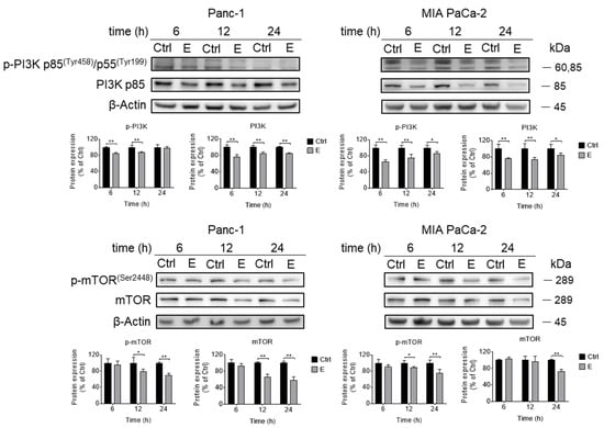 The inhibition of Akt activation led to a reduction in mTOR activation in Panc-1 and MIA PaCa-2 cells. In addition, EGCG inhibited upstream events in Akt activation, including IGFR and PI3K phosphorylation (Figure 3e).