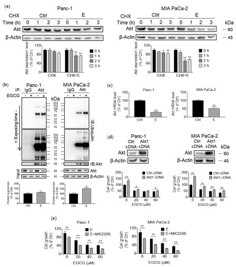 Given that protein ubiquitination plays an essential role in modulating protein degradation, we immunoprecipitated Akt and assessed whether ubiquitination levels of Akt were affected by EGCG. In MIA PaCa-2 and to a lesser extent in Panc-1 cells, EGCG significantly enhanced Akt ubiquitination (p < 0.01 for both; Figure 4b). Finally, we examined the effect of EGCG on transcription levels of Akt by qPCR. EGCG significantly decreased Akt mRNA levels in Panc-1 cells and to a lesser extent in MIA PaCa-2 cells (Figure 4c).