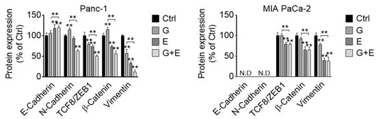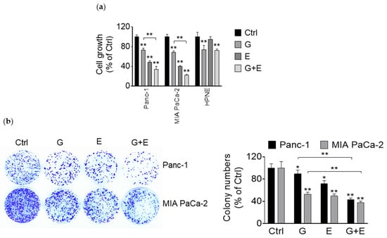EGCG enhances the cell growth inhibitory effect of gemcitabine in pancreatic cancer cells. (a) Cell growth was determined in Panc-1, MIA PaCa-2, and HPNE cells following treatment with EGCG (40 µM), gemcitabine (20 nM), or both for 72 h. Results are expressed as a percentage of control. ** p < 0.01 vs. control. (b) Panc-1 and MIA PaCa-2 cells were treated with EGCG (E), gemcitabine (G), or both (G + E) for 48 h, and the colony formation capacity was determined. Results are expressed as a percentage of control. * p < 0.05, ** p < 0.01 vs. control.