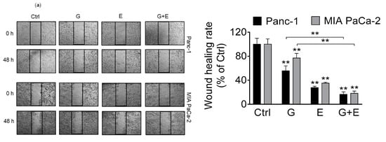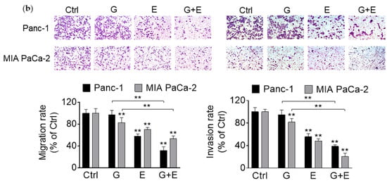 EGCG enhances the inhibitory effect of gemcitabine on cell migration and invasion. (a) Panc-1 and MIA PaCa-2 cells were treated with EGCG (E), gemcitabine (G), or both (G + E) for 48 h, and the wound healing rate was determined. Results are expressed as a percentage of control. ** p < 0.01 vs. control. (b) Migration (left) and invasion (right) rate were further decreased by the combo in Panc-1 and MIA PaCa-2 cells. Representative images are shown (×200). Results are expressed as a percentage of control. ** p < 0.01 vs. control.