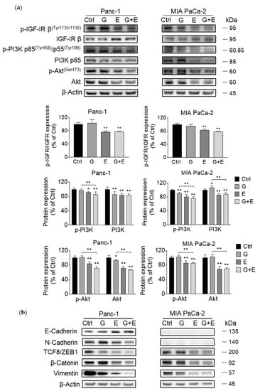 EGCG enhances sensitivity of gemcitabine on Akt and EMT pathway inhibition. (a) Co-treated with EGCG (E), the suppression effect of gemcitabine (G) on Akt pathway is enhanced. Immunoblots for phosphorylated/total IGFR, phosphorylated and total PI3K, and phosphorylated and total Akt in whole cell protein extracts from Panc-1 and MIA PaCa-2 cells treated with EGCG (E), gemcitabine (G), or both (G + E) for 12 h. Loading control: β-Actin. Bands were quantified and results are expressed as a percentage of control. * p < 0.05, ** p < 0.01 vs. control. (b) EGCG plus gemcitabine further inhibit EMT. Immunoblots for E-Cadherin, N-Cadherin, TCF8/ZEB1, β-catenin, and Vimentin in whole cell protein extracts from Panc-1 and MIA PaCa-2 cells treated with EGCG (E), gemcitabine (G), or both (G + E), for 48 h. Loading control: β-Actin. Bands were quantified and results are expressed as a percentage of control. ** p < 0.01 vs. control.
