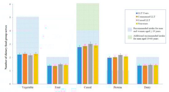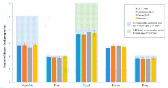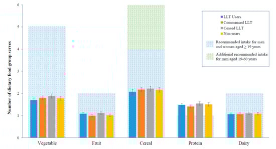 However, to date, no studies have examined whether the daily dietary intake of key food groups differ between LLT users and non-users. One study suggested that LLT alone reduced the total serum cholesterol by 20%, and, with the addition of a diet and exercise program, serum cholesterol levels further decreased by 19% []. This is an important aspect of disease prevention, as most dietary advice given to the general population is given by referring to food groups.