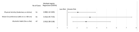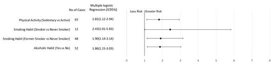 After multiple logical regression analyses, sedentary behavior and regular consumption of alcoholic beverages were found to be risk factors for breast cancer regardless of menopausal status (Figure 1 and Figure 2). In addition, elevated WC increased the risk of breast cancer in premenopausal women (3.31; CI 1.45–7.55, p = 0.005; Figure 1). On the other hand, current smoking (2.43, CI 1.01–5.83, p = 0.03) or a previous history of smoking (1.90, CI 1.14–3.14, p = 0.006) increased the risk of breast cancer in postmenopausal women (Figure 2).