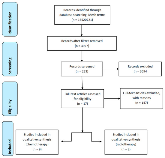 For this review, we researched on-line databases PUBMED, MEDLINE, EMBASE and the Cochrane library up to March 2019, using the following terms: ((Chemotherapy) or (radiotherapy)) and ((oral mucositis) or (diarrhea) or (peptide diet) or (elemental diet) or (oligomeric diet)) in order to collect potentially relevant articles. Animal, not clinical, trials and non-adult studies were excluded. Retrieved articles were reviewed for relevance, duplicates were discarded, and the full text of all potentially relevant articles was classified and assessed for inclusion using predetermined criteria. Only clinical trials about oligomeric elemental or peptide enteral nutrition were screened. Reference lists of all of the included articles were reviewed for additional possibly relevant citations. Further details about the literature search process are provided in Figure 1. Relevant studies were identified [52,53,54,55,56,57,58,59,60,61,62,63,64,65,66,67,68], and their results are summarized in Table 2 and Table 3.