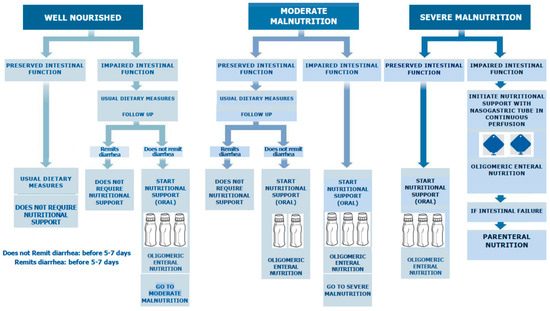 With these two aspects evaluated, we could encounter a case within the most advantageous diagnosis of a well-nourished patient without diarrhea, in which only regular dietary measures to prevent the risk of malnutrition would be necessary. On the opposite side of the spectrum, we would find a patient with severe malnutrition and diarrhea, where a nutritional treatment using exclusive enteral nutrition with an oligomeric formula would be required. Thus, the therapeutic possibilities will vary from less to more complexes, depending upon the patient’s initial nutritional situation and the existence of OTRD. These courses of treatment will range from the usual dietary recommendations, to supplementation with oral oligomeric enteral nutrition, complete enteral nutrition with oligomeric formula and then to finally total parenteral nutrition.
