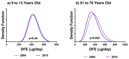 Figure 1 illustrates the 2004 and 2015 usual intakes of DFE for (a) females 9–13 and (b) for females 51–70. There is no significance difference between the mean usual intakes of DFE between the two cycles for females 9–13 (p = 0.40). Females 51–70 reported significantly larger mean usual consumptions of DFE in 2004 (p = 0.002).