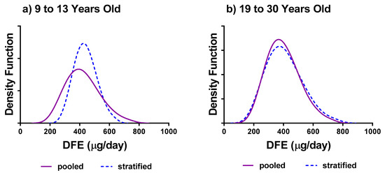 Comparison of estimates of usual intake distribution of DFE (μg/day) between pooled versus the stratified approach for (a) females 9–13 years old; and (b) females 19–30 years old. Data Sources: Statistics Canada, 2004 and 2015 Canadian Community Health Survey—Nutrition Share files.