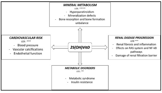 The principal circulating form of vitamin D is 25(OH)VitD. In the early 2000s, the presence of 1-α-hydroxylase enzyme was noted in many tissues outside the kidneys, and a certain binding affinity of 25(OH)VitD for vitamin D receptor (VDR) was demonstrated [23,24]. Almost all tissues and cells, including brain, heart, skeletal muscle, smooth muscle cells, pancreas, activated T and B lymphocytes, and monocytes express the vitamin D receptor (VDR) [25]. Consequently, much experimental evidence has implicated the hypovitaminosis D (25(OH)VitD and/or 1,25(OH)2VitD) and the reduced activation of VDR in the modulation pathological processes also beyond CKDMBD [26]. The principal effects and their level of evidence (LOE) of n-hVitD in CKD patients are summarized in Figure 1.