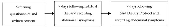 A repeated measures design was used to compare baseline functional bowel symptoms experienced over 7 days, whilst participants followed their habitual diet, to symptoms experienced during a 7-day intervention period of adhering to the 5Ad Dietary Protocol. Those eligible for the study were asked to complete a baseline evaluation questionnaire over the 7 days whilst following their usual diet. Upon completion of the baseline period, participants were given a copy of the 5Ad Dietary Protocol including detailed instructions for following the approach, and an intervention evaluation questionnaire to be completed in the same way as the baseline questionnaire, whilst following the protocol for the 7 days (Figure 1). Email was the main method of delivering the forms and returning the completed forms, telephone conversations were also used in response to some clients’ questions, and face-to-face meetings occurred for the participants living nearby. Two participants used postal mail for the return of their completed forms.