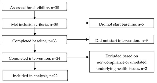 The participants were recruited using a rigorous screening questionnaire and an 11-page food frequency questionnaire (FFQ) to ensure that they were not following any specific medical diets (e.g., diabetic) or the low FODMAP diet and that they did not have any health issues that we would need to be concerned about during the intervention. Those who were using non-prescribed medication/supplements were eligible only if they agreed to keep the same therapy during the baseline as well as the intervention phase. One participant was taking a prescribed medication, and she obtained permission from her GP to participate in the study. Apart from this one participant, none of the other participants were following a specific diet nor had medical issues that would require further consultation. Based on the FFQs and screening questionnaires, all participants had been consuming variations of common foods. Additionally, there were a few cases of self-avoidance of mainly milk and wheat products. All 38 of the subjects screened for the study were deemed eligible to take part. Of these, 5 did not start the baseline period for unspecified reasons, and 33 completed the baseline period. A total of 9 subjects did not start the intervention period for unspecified reasons and 24 completed the intervention period. One subject was excluded based on self-reported non-compliance and one due to unrelated underlying health issues, leaving 22 subjects (16 women (73%)) included in the analysis (Figure 2). Baseline characteristics are shown in Table 1.