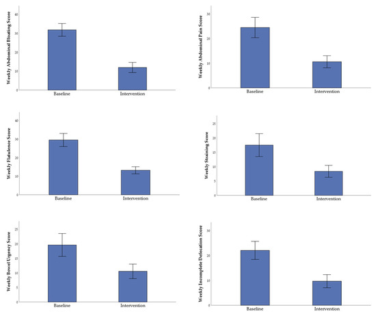 The mean (± SE, n = 22) weekly cumulative abdominal symptom scores after 7-day baseline period (participants’ habitual diet) and 7-day intervention period (adherence to 5Ad Dietary Protocol). SE represents standard error; all variables showed a significant difference from baseline to intervention (p < 0.01) using repeated measures MANOVA testing.