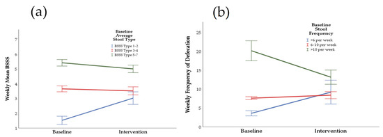 Normal defecation frequency is classed as experiencing between three bowel movements per week to three per day [33]. In this present study, six to ten bowel movements per week was considered a more appropriate estimation of normal/desirable bowel function. Therefore, weekly stool frequency was categorized into the following baseline subgroups: low (<6), medium (6–10), and high (>10). Defecation frequency, however, has in fact been shown to be unrelated to intestinal transit time or daily faecal weight [33], which are both measures of intestinal and digestive health [34]. IBS subtype classification, however, is based largely on predominant stool form/consistency [5] which, based on the validated Bristol Stool Scale, is suggested to be well correlated with transit time and faecal output [33,35].