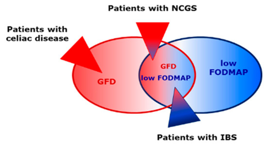 The market for gluten-free products has been increasing steadily and gluten-free diet (GFD) is becoming more and more popular. About 0.7–1.4% of individuals suffer from celiac disease [1] and gluten sensitivity is estimated to affect up to 6% of humans [2]. While all these patients need to follow a GFD, the vast majority of consumers of gluten-free products buy them for other reasons, e.g., a belief that the products are better for health, weight loss, or for fear of a toxic gluten effect [3,4,5]. Surveys have shown that the popularity of GFD is highest in Latin America, the Middle East, and America with 32%, 28%, and 15–21% of the population following a GFD, respectively [3]. This article summarizes who really needs a GFD and which patient groups would instead benefit from a low FODMAP diet (fermentable oligo-, di-, monosaccharides, and polyols).