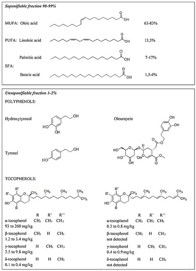 | Hydroxytyrosol Tyrosol Oleuropein Olive oil polyphenols Oleic acid MUFA3 Olive oil Vitamin E Tocopherols Tocotrienols | Nutraceutical properties Antioxidant Anti-inflammatory Cardiovascular effects Metabolism Bioavailability Clinical trials Preclinical studies |